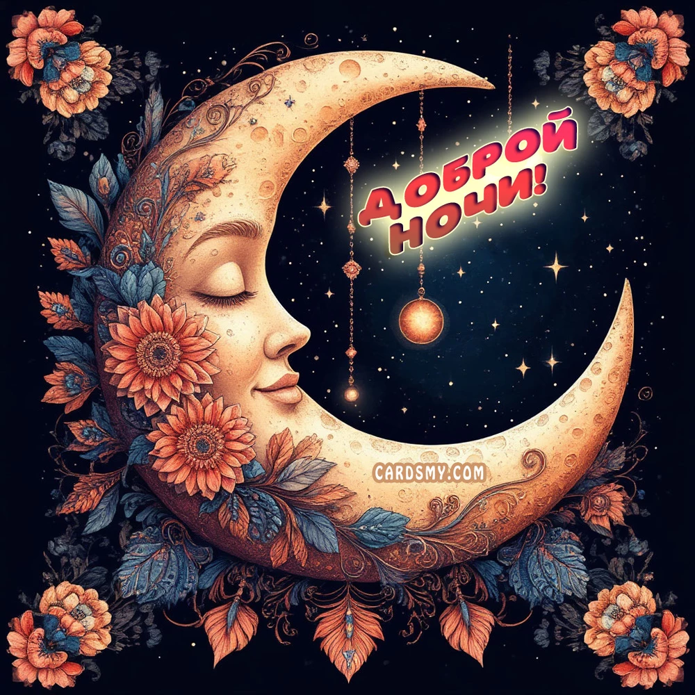 Декоративный рисунок с цветами и текстом на фоне луны "Доброй ночи".